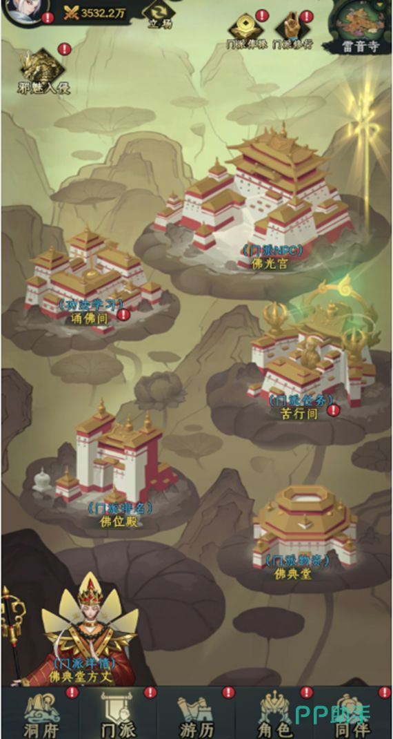 中立方面排在第一位的是雷音寺,这是一个处于西方极乐世界的净土,净土中央有着一尊大佛,他的佛光普照着众多弟子,里面修炼的是外功,最出名的就是罗汉金身了,在释放后可以短时间内抵御大量伤害,是六大门派中最强的防御。