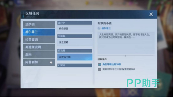 首先打开任务列表,玩家可以看到对应区域的详细信息和领取要求,每一个都需要玩家的级别和探索度。这时候我们第一时间领取任务,然后前往任务地点。