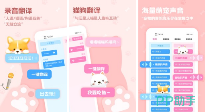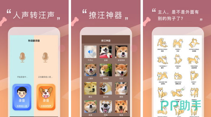 这款软件的功能顾名思义就是帮助主人和宠物交流用的,通过这款软件能够让人和狗更好的交流,如果家里面有一只狗狗的话不妨下载之后体验一下吧。