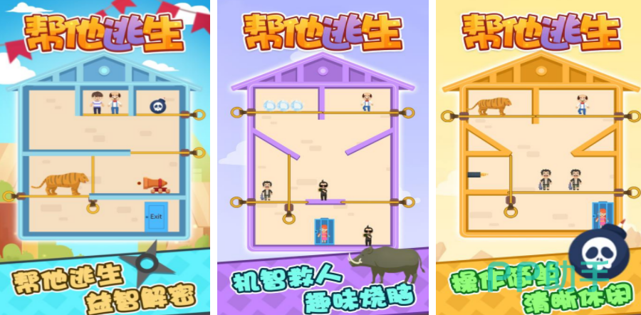 《帮他逃生》游戏画面采用卡通风格,每一关卡的任务不同,玩家需要想法设法灵活的面对遇到的问题,找到线索将人物解救出来。
