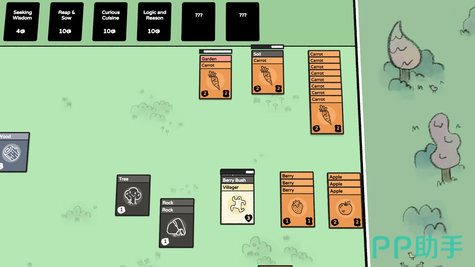 总而言之,小伙伴们在该游戏里,想要什么东西,都是能通过堆叠不同卡牌来获取的,其实就相当于另一种形式的卡牌建造游戏了。举个最为简单的例子,如果小伙伴们在游戏里需要收集浆果的话,那么只需要将村民卡叠在浆果丛的卡上,就能得到浆果卡了,非常的简单明了。