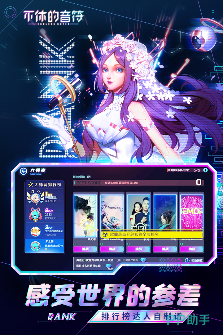 钢琴节奏游戏,各个年龄段的玩家都可以玩,有着中文音乐库以及超多丰富的歌曲,游戏采用那种传统的下落式按键的玩法,还加入了滑动音符的设定,谱面手感很棒,曲库更是经常更新,让大家每次都有新体验。
