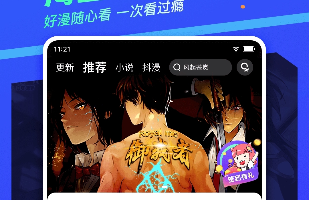 国内比较知名的原创动漫app,一些大作,比如《死神》以及国漫系列这些被圈内圈外人群所熟知的作品都来自此平台,日更千页的全彩漫画,给大家带来良好的视觉体验,这里总有一款你喜欢的。