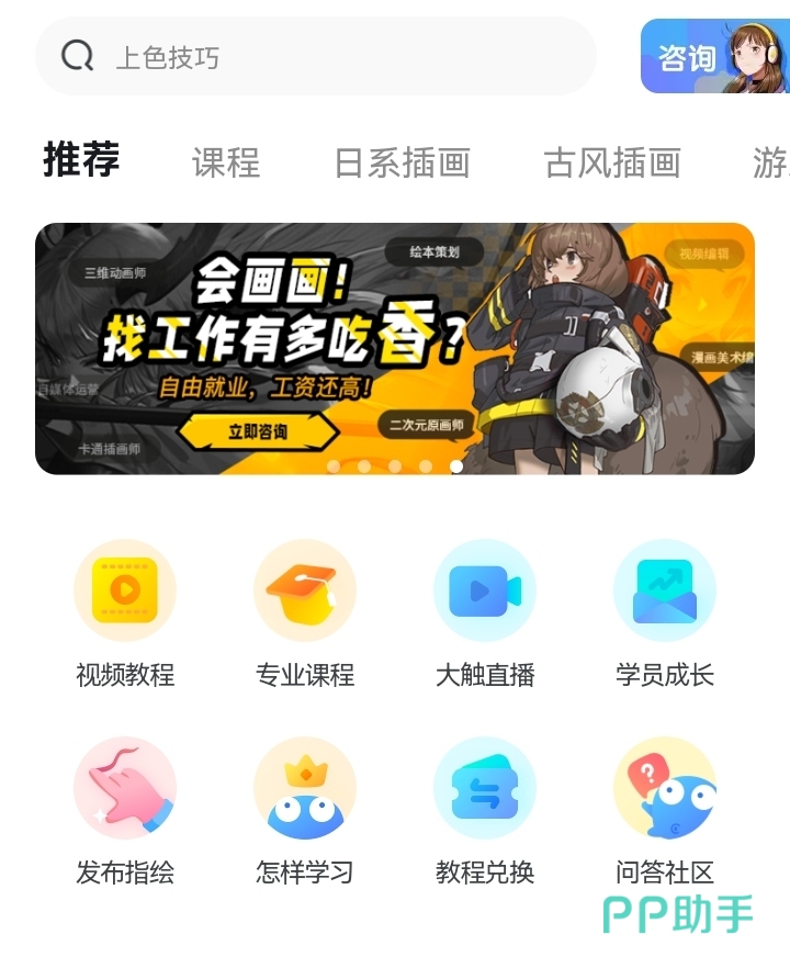 这是一款专门学习画画的app,有很多绘画精品课程,学员可以自由选择辅导时间,想听哪位辅导老师讲解,还可以约课,或者观看课程直播等,有多种学习方式,课后还有手机画板可以练习,手机上随时随地都能画画,是款很不错的学习绘画app!
