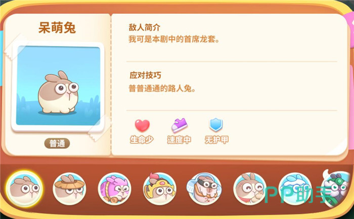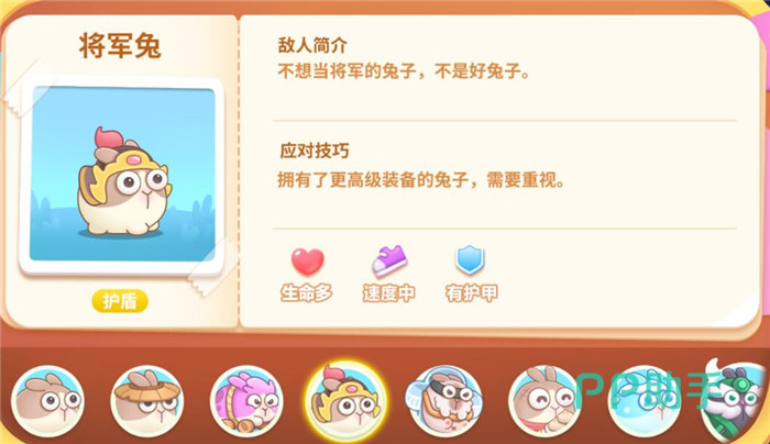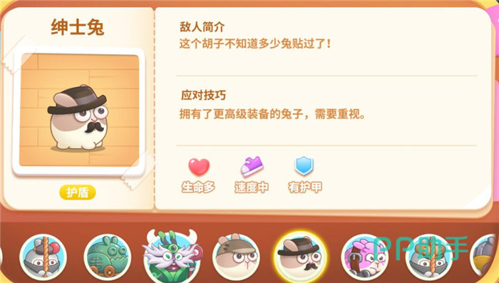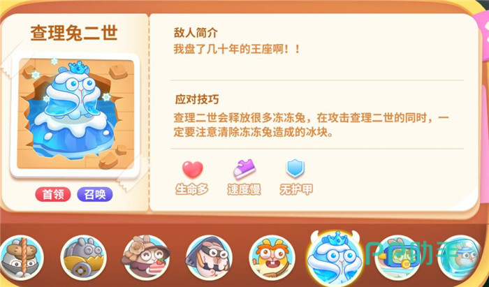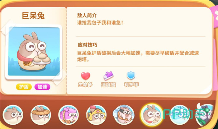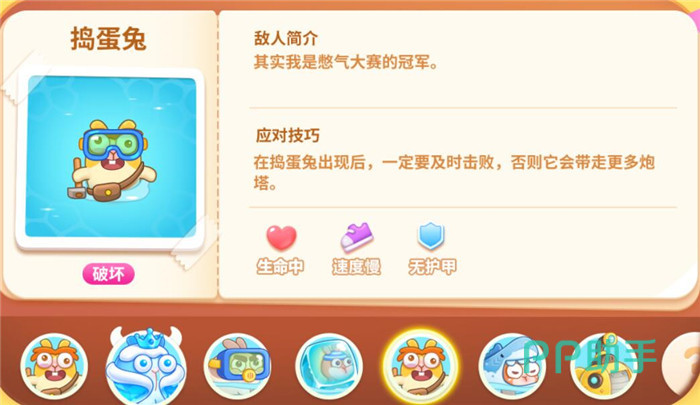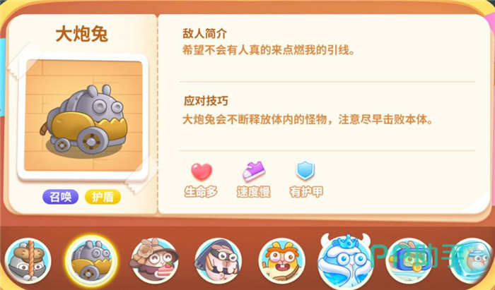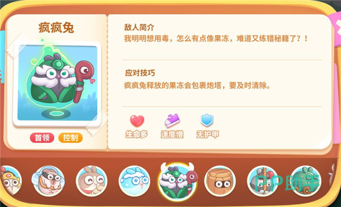 血量高,速度慢,无护甲,它会释放很多的冻冻兔,所以打它的时候要及时清理冻冻兔哦,不然炮塔都被冻住,怪物可就直接过去了。