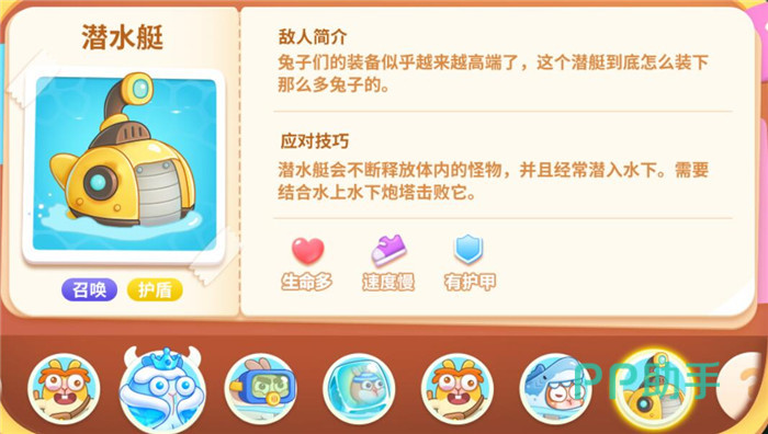 血量高,速度慢,有护甲,它会不断释放怪物,并经常潜入水下。需要结合水上和水下炮塔攻击,而且还要尽早的破除护盾。
