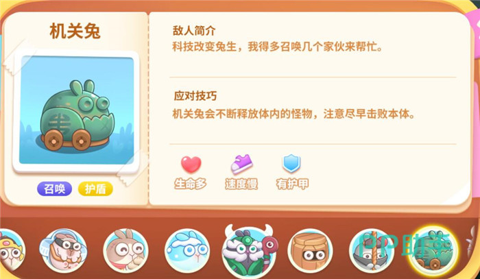 血量高,速度慢,有护甲,机关兔会不断释放体内的怪物,所以尽早的击败本体才行。