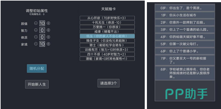 《人生重开模拟器》是一个通过改变颜值、智力、体质、家境的值,来实现不同的人生,人生是不完美的,拥有了极高的颜值,生活也许也不是很尽人意,家境最低,也有可能早夭,脑力风暴吧,玩家们,让自己全方面发展,将自己在游戏中的人生活得精彩。