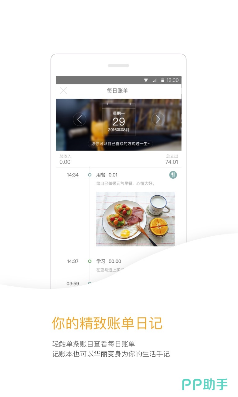 软件实现极简记账,快速掌握收支明细,让资金流水自动同步到云端,通过折线图、圆饼图快捷呈现账目情况,按照日历记录账目,快捷导出账目数据。