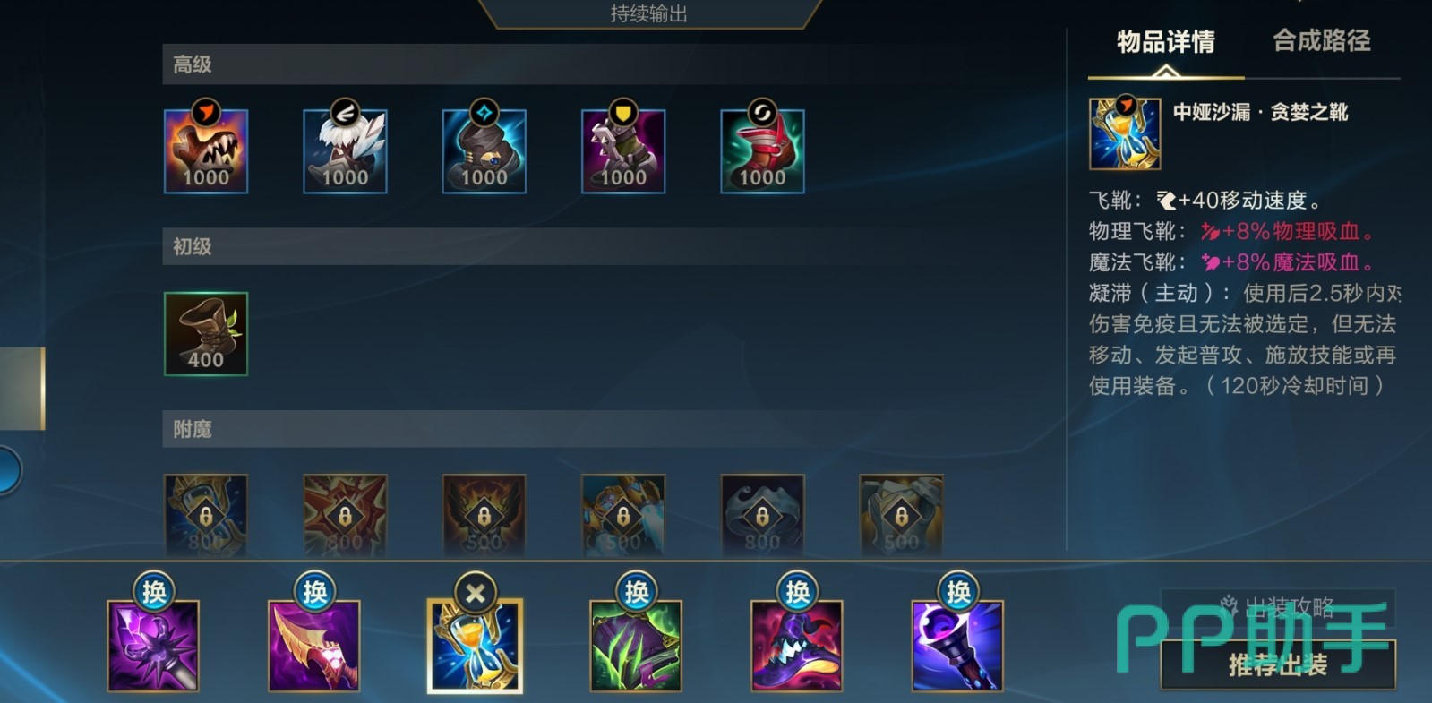 然后靴子方面目前手游里没有法穿鞋,所以可以考虑用水银靴,因为卡萨丁还是很怕被控制住的,附魔金身。至于后面则可以出一些防御向的法术装备,例如女妖面纱来躲技能。如果对面物理伤害多,出个水晶反射器也可以提升一下坦度。