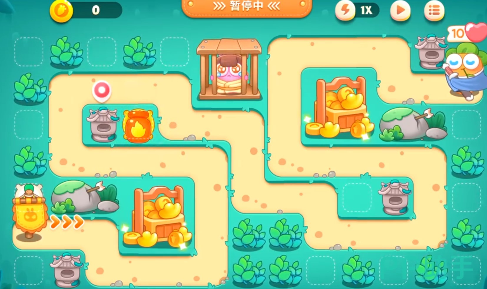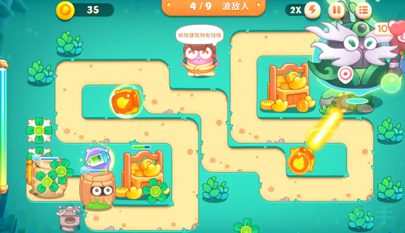 同时四叶草的攻击还附带穿透效果,能在攻击敌人的同时清除周围的障碍物,所以这个炮台在之后一定要多建造几个,第二个炮台选择火油瓶,位置放在最侧圆圈地形内,一级的火油瓶还无法攻击到传送口刚出的敌人。