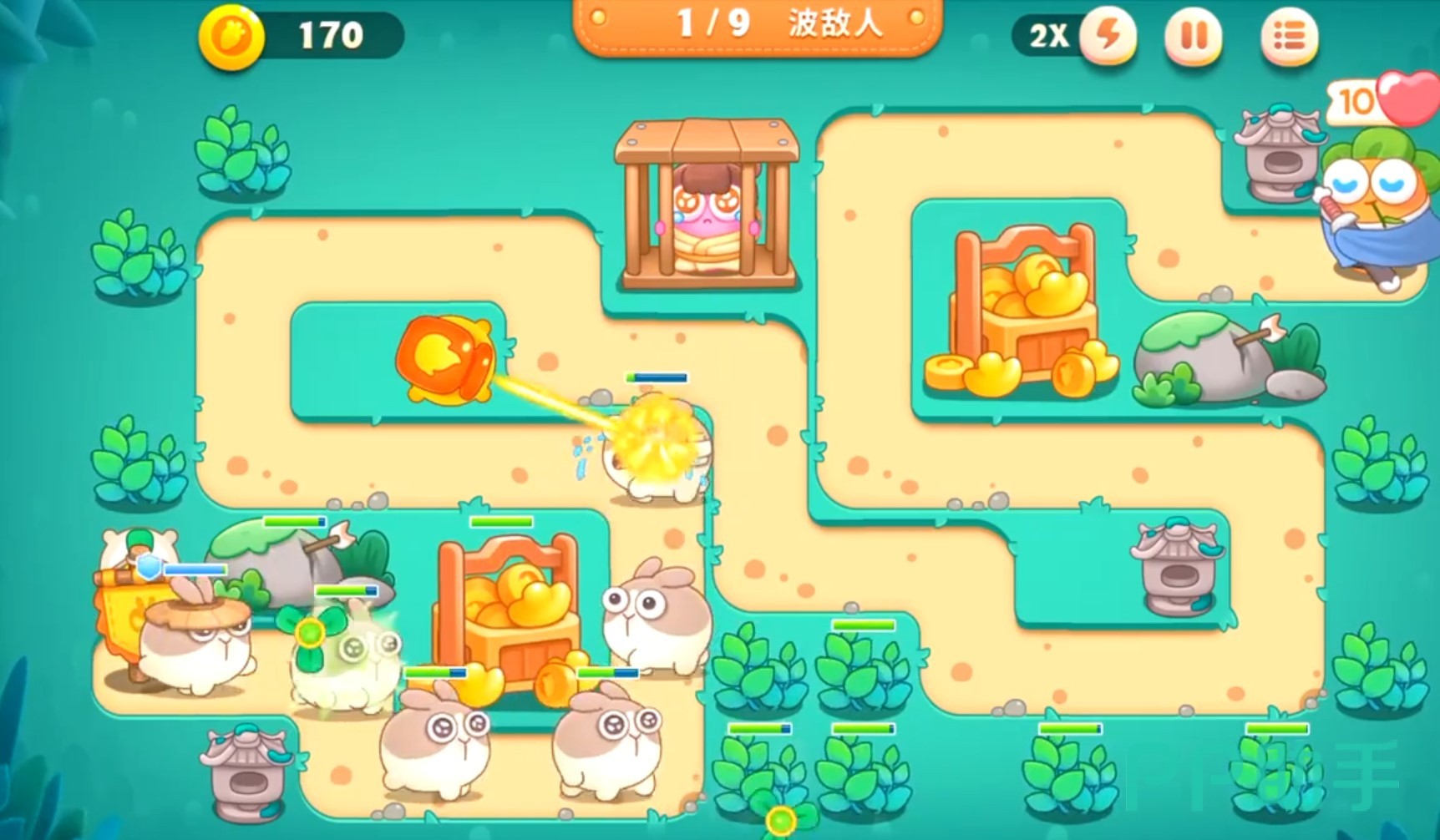 他叫疯疯兔是小萝卜的劲敌,他可以飞行在地图上空,同时会发射很多类似果冻一样的东西,当这些果冻碰到你的炮台后,会直接冻结他们,你们要快速点击这些果冻,才能解救出炮台,当疯疯兔的血量被清空后,就可以赢得游戏胜利啦。