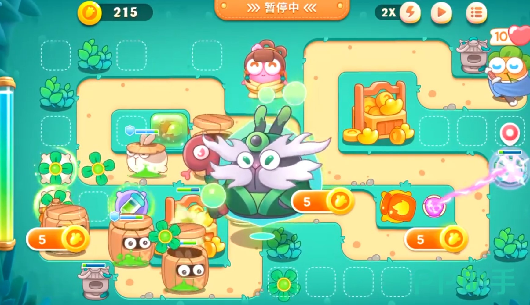 因此大家可以先用她来攻击旁边的障碍物,因为火油瓶是持续攻击所以摧毁的速度还是非常快的,这里建议大家先清除那些小的障碍物,因为大的血量比较厚,没有高级炮台之前,基本上很难直接推掉,当大家到达第三波时,会出现一个大BOSS。