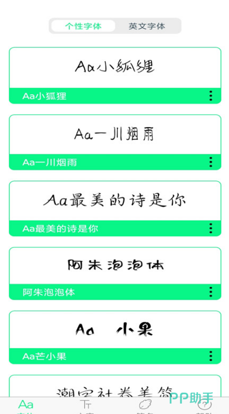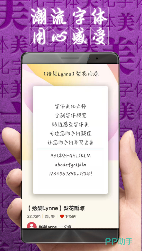 内置海量字体可进行决心更换,可根据用户使用习惯进行个性化字体推荐,帮助用户找到最心仪的字体。及时更新字体,让用户找到潮流、个性的字体。增添明星字体,字体涵盖当下潮流偶像。