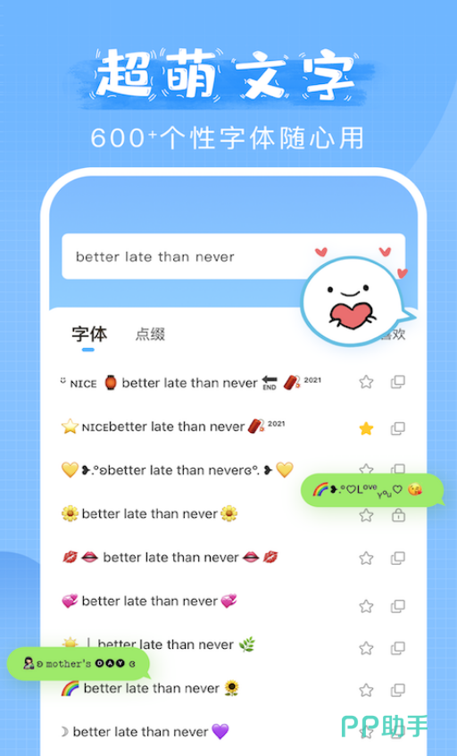 字体类型多样 ,可使用各种可爱花体字体和可爱表情符号、颜文字、文字装饰等素材素材。可在抖音、小红书、微信等社交平台进行分享使用,内置热门文案内容和社交金句,避免出现文案荒。