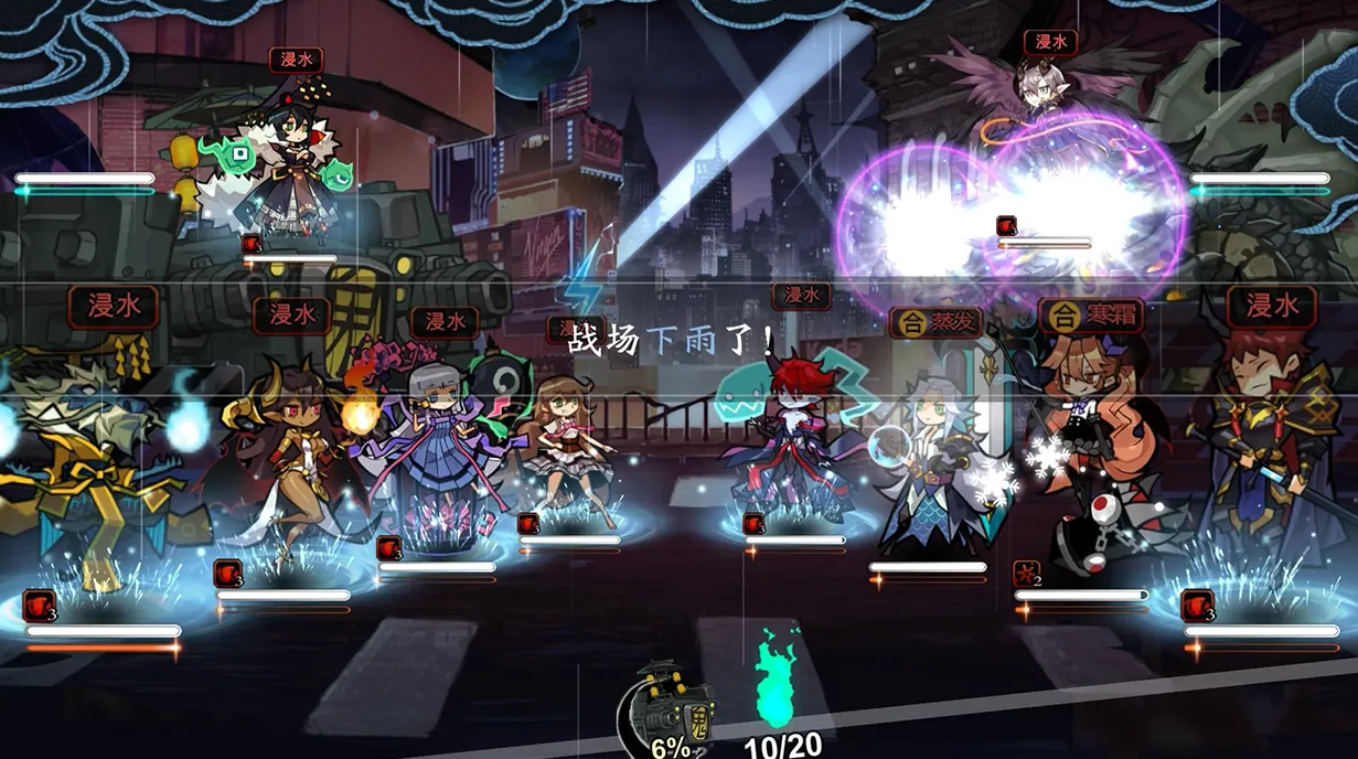 战斗模型全动作游戏标准制作,命中,空挡,眩晕等攻击都一一展示!传统的2D动画表演的重要角色动作,可以在2D回合系统中体验到巨大的勇气和超奢华的战斗感;丰富而随机的场景事件使战场变得更加多变!在对付敌人时,我们应该考虑火山岩喷发和雷雨天气的影响。