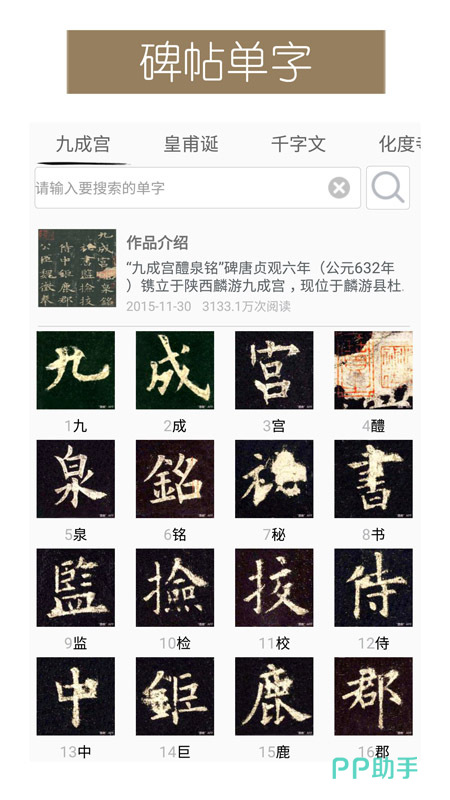 字典集字,用户可进行书法创作,通过软件的诗词一键生成模仿相关书法字,也可支持网络打卡功能,通过拍照对比原帖,系统会根据用户写的字来自动评分。