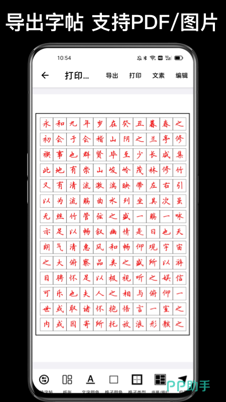 支持练习各种字体临摹,布局为高雅字帖体,而且支持导出字帖进行方便纸质练习,多对照打卡练习,精选字体、汉字书写教程、字体PDF或者图片输出一键即可生成。