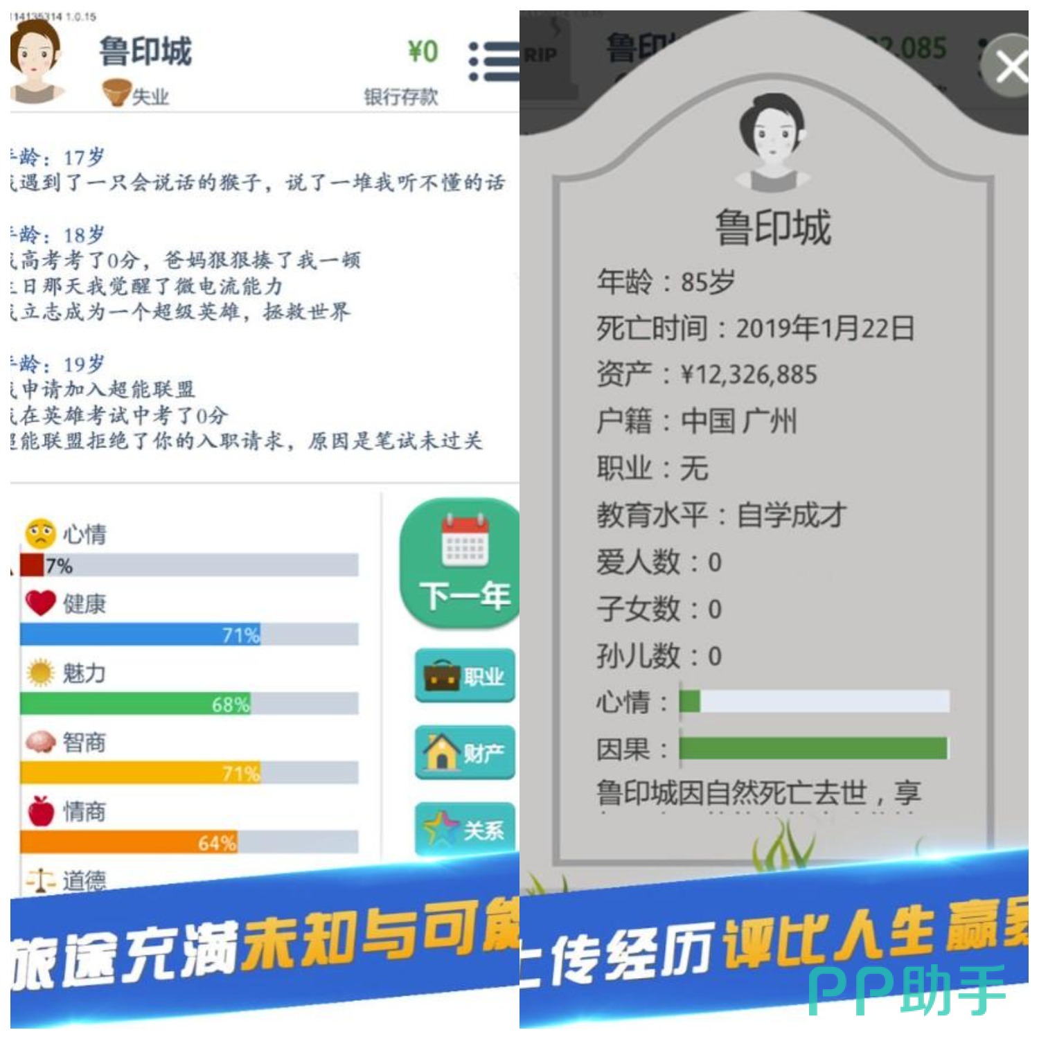 本款游戏是以文字为表现形式的轻度模拟人生游戏。每一局游戏都会随机生成出生家庭,随机出现你将遇到的事件,你需要在不同的事件中做出选择,当然这些选择会影响到你的心情、健康、魅力等属性,也会影响到你后续的人生,所以请谨慎选择。游戏中该有的元素还是有的,学生时代的上学,考试,高考报志愿,工作时期的升职加薪,辞职跳槽,还有各式各样的活动可以参加,你甚至还能相亲,结婚,计划二胎,在短短的几分钟里快速经历完整的一生。