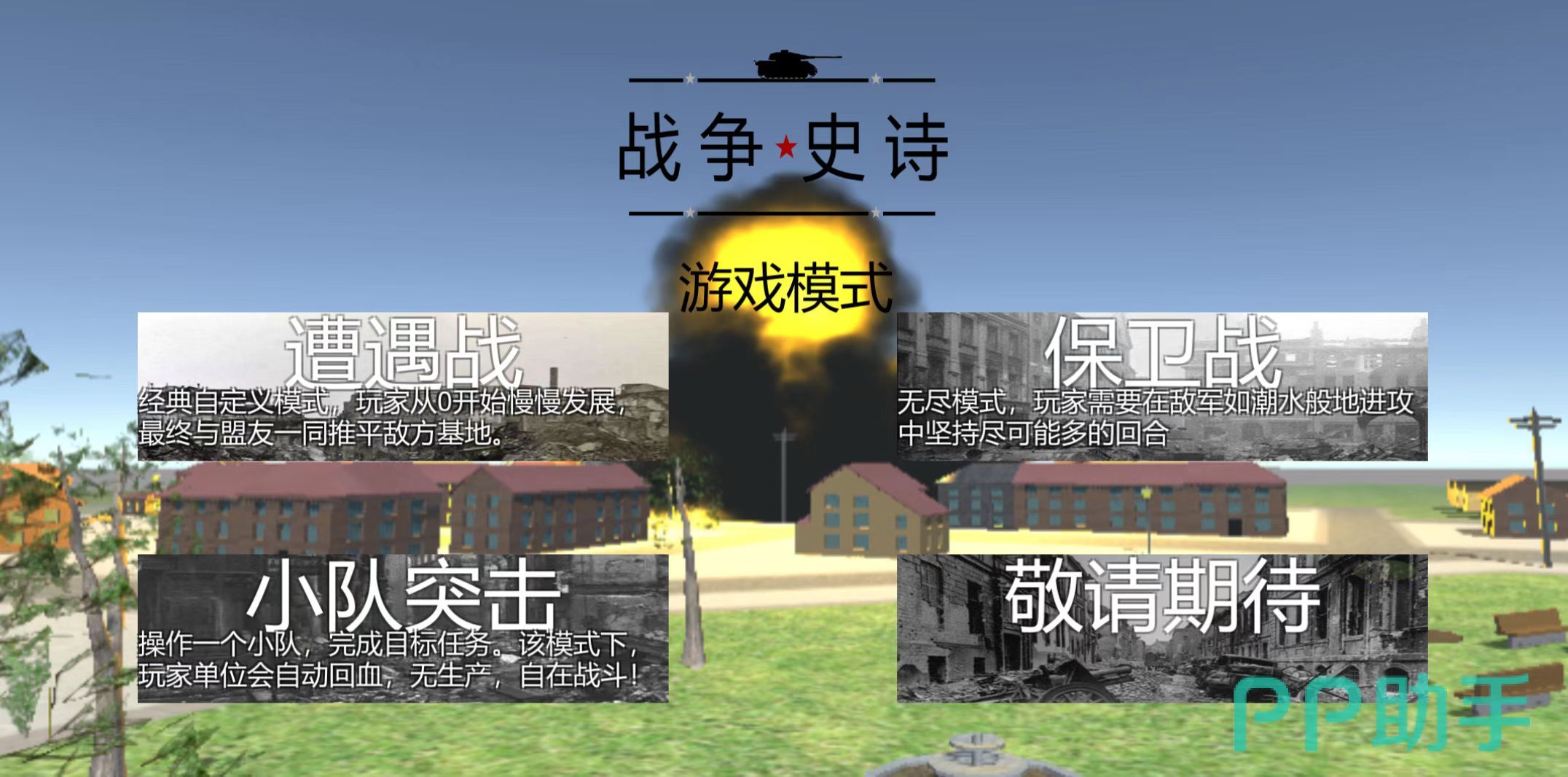 游戏内玩家将来到第二次世界大战时期,游戏分为遭遇战、小队突击、保卫战三种模式,可供玩家自由选择。所谓的遭遇战就是传统的红警玩法,玩家可以从同盟国和非同盟国中的六个阵营中任选其一,每个阵营在军事方面都有着各自优势。该模式下玩家开局只有一辆可移动基地车和矿车,需要玩家从最近的空地开始,通过升级军事科技、打造军事建筑、生产军队、搜集矿产来慢慢发展。届时经典的幻影坦克、直升机、美国大兵、防空大炮都将悉数登场。玩家在有了一定的军事能力后,就可以从军事的角度出发,部署一系列的战略,营造出出海陆空三军大战的宏大现代战争场景。