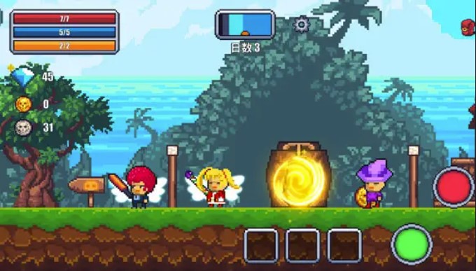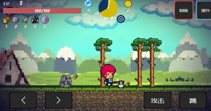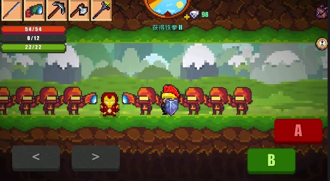 画面左下方的虚拟按键控制人物左右移动,画面右下方的A键对应道具装备的使用,人物对话,攻击等操作,B键则是在主角精力充足的情况下,控制人物跳跃,进行多次空中跳跃。游戏以探索世界、建造城镇、收集道具装备为主要目的,如果探索的话必须按照步骤进行,与城镇NPC传送员对话即可开启你想要前往的地图,注意所有地图副本都标明了副本的属性和特色,玩家可以选择适合自己的副本进行进入。