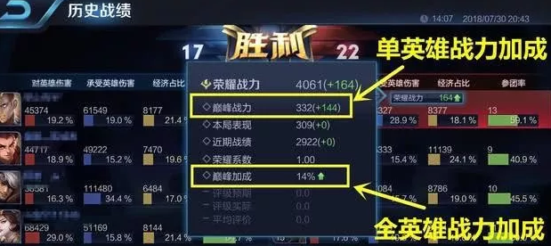 巅峰战力+本局表现+近期战绩(排位基础分)+巅峰加成(全英雄战力加成比例)