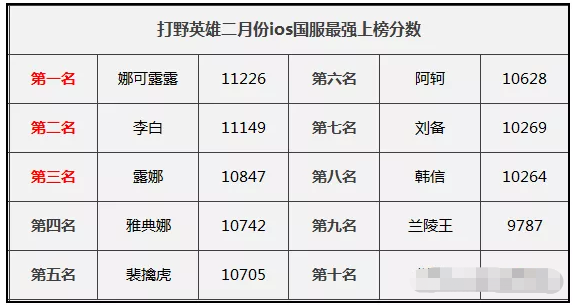 IOS微信区前三:娜可露露、露娜、李白;IOSQQ区前三:阿轲、露娜、娜可露露。