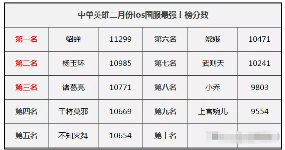 貂蝉11229、娜可露露11226、李白11149、花木兰11012、杨玉环10895。