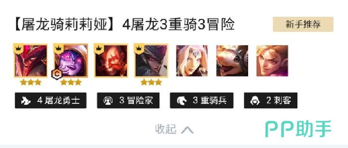 这里给大家推荐的阵容是屠龙骑士莉莉娅,组成的棋子有弗雷尔卓德之心·布隆、狂战士·奥拉夫、含羞蓓蕾·莉莉娅、皎月女神·戴安娜、北地之怒·瑟庄妮、老鼠图奇、刀锋之影·泰隆,最终组成的羁绊为四屠龙勇士(当己方队伍中没有龙神羁绊棋子时,会额外提升百分之五十的法伤,并且对方血量在两千两百点以上的棋子会削弱百分之二十的全额伤害)。