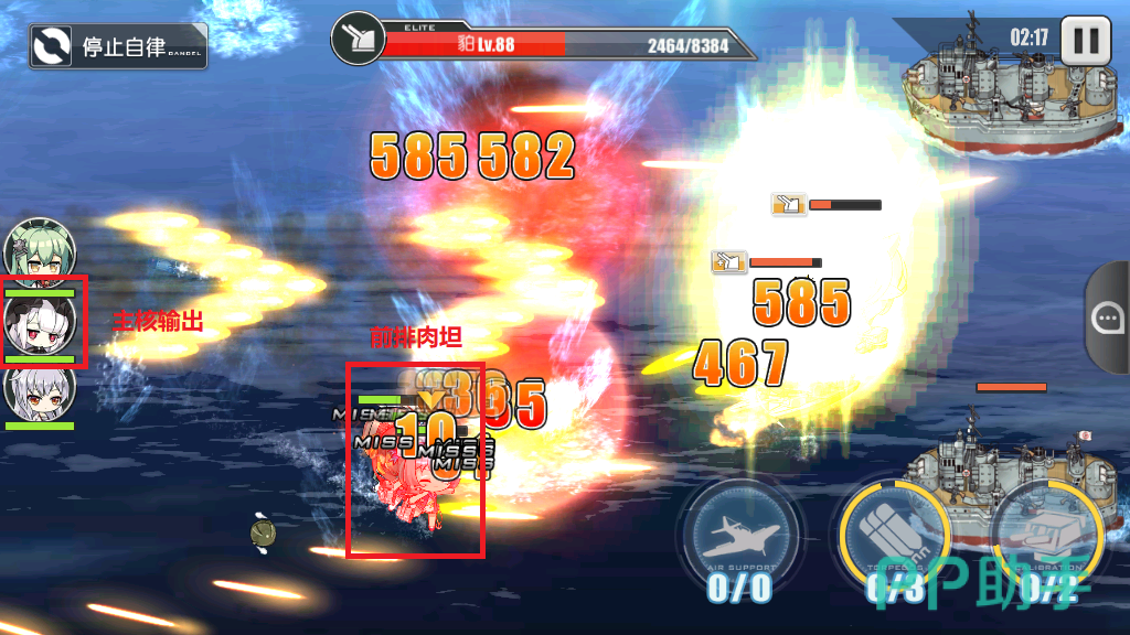 后排是低耗输出战神-黑暗界、最高奶-明石和副输出-日向。作为旗舰的黑暗界如果有足够的装备支撑其[技能-无限之darkness]只要一触发就足以在9-1的道中清屏,而副输出位日向提供的增益BUFF[技能-炮术指挥·主力]能提供大量的炮击加成,且自身增益炮击,足以清除道中的小BOSS,加快通关速度,最后由明石提供的奶量支撑道中队弹药不足输出下降时,所需要的回复坦度以保证自律的安全性。