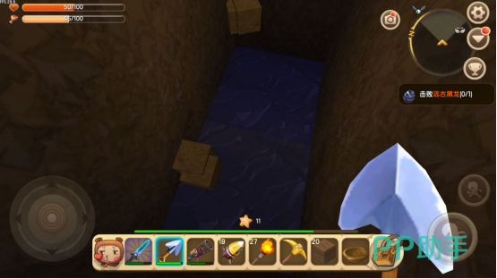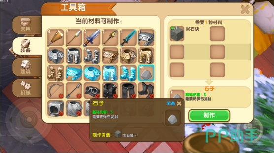 三、最后一种就是利用无所不能的工具箱,在工具箱里面大部分的物品只要材料收集到,就可以完美的制作。只要在随意挖一个坑,挖到四层左右,就能露出石块,挖掘几个石块,然后再利用工具箱就能合成石子了。石子的合成方式,在武器那一栏,一个石块能够合成四个石子。