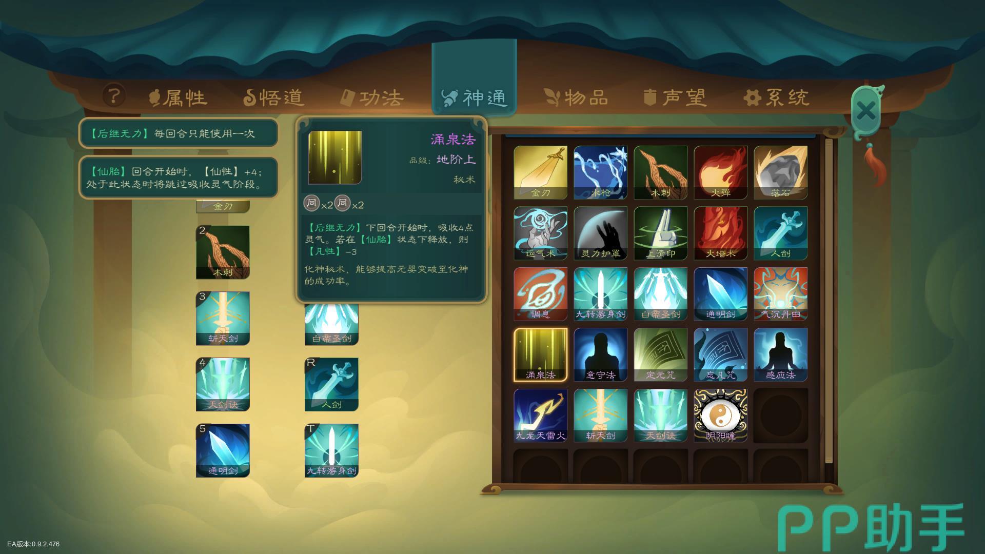 涌泉法可以通过消耗2种不同的灵气,来让你在下回合开始时,吸收4点灵气。若在仙胎状态下释放,则凡性-3,忘凡咒则是只能在仙胎状态下释放,本回合结束时,若仍处于仙胎状态,则凡性-4,定元咒可以通过消耗2种不同的灵气,效果是凡体状态下方可使用。下一次进入仙胎状态时,吸收4点灵气,意守法的效果是下回合开始时若处于仙胎状态,则每有仙性*10,吸收一点灵气。九龙天雷火的效果是使用相生的灵气释放时,淬体+3;使用相克的灵气释放时,塑魂+3。