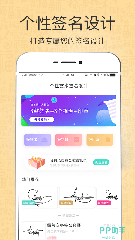 这是一款专家在线设计的签名软件,平台上有各种高级书法专家进行在线设计,并且有高新的视频教程,帮助用户体验在线艺术签名的设计,甚至还有印向钱总裁签心情签等多种不同的签名设计。