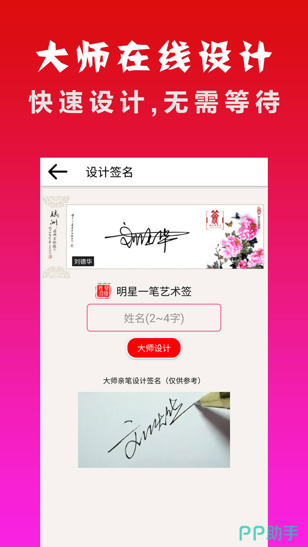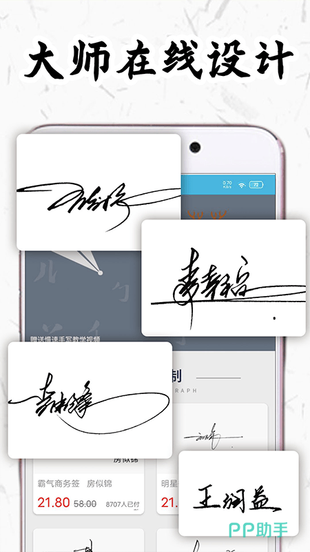 这款大师参与在线设计的签名软件当中,用户能够直接为自己打造完美的签名草书,一笔签,个性签以及商务总裁签等多种不同的签名形式,数十种签名样式任君挑选,还可以直接在手机上实心在线临摹,提升签名水平。