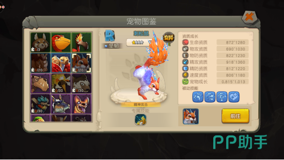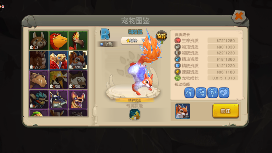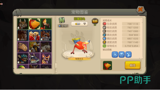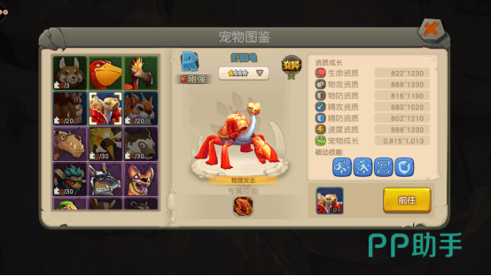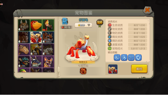 接下来是R级宠物,R级宠物的名字是蓝色的,相对于N级宠物来说更加稀有,R级宠物一共有两只。第一只是虾脚龟,它的属性是刚强,也属于物理攻击。虾脚龟有一个专属技能,同时拥有四个初始被动技能,他的资质成长比N级宠物要高。获取方式是在宠物宝库中抽取或者利用二十个蓝色宠物碎片合成。