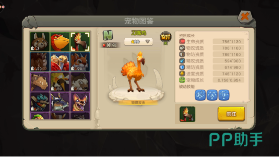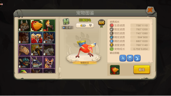 第二个是巨嘴鸵鸟,巨嘴鸵鸟的属性是坚韧,也属于物理攻击,巨嘴鸵鸟也没有专属技能,同时又三个被动技能。获得方式是利用绿色碎片或者巨嘴鸵鸟碎片合成。