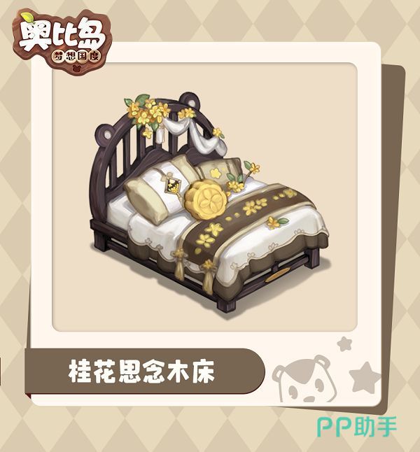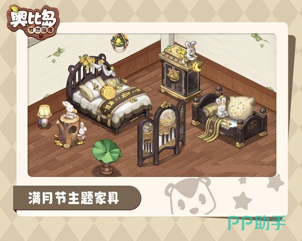 中秋系列的家具采用了古典风格,整体色调和搭配都有着浓郁的中秋气息。第一件是桂花思念木床,它床头雕刻着熊耳形状,还有着桂花点缀,床上面放置了一个月饼样式的抱枕,看起来很是香甜柔软。它的获取方式为星愿卡。