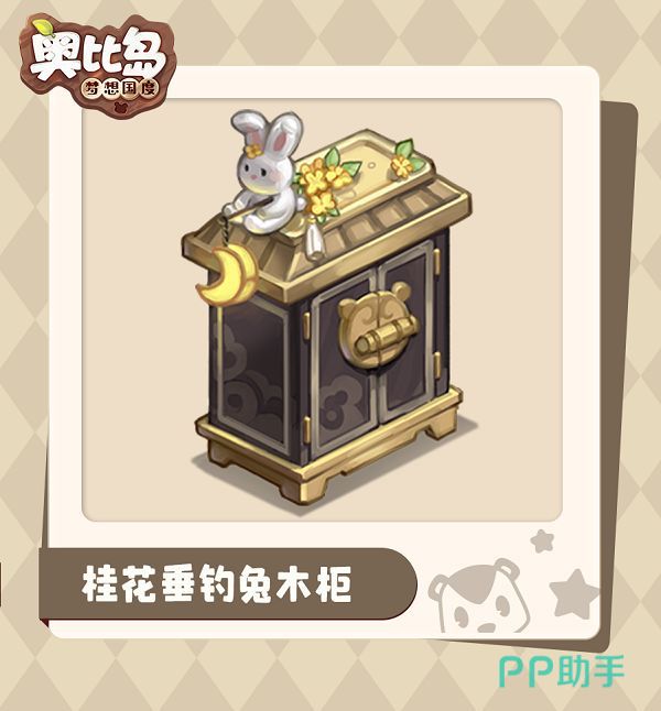 桂花钓月兔木柜的样式采用传统房屋的版型,在这屋顶上海坐着一只垂钓月亮的小兔子,生动形象小伙伴们真的不心动吗,它的获取方式是星愿卡。
