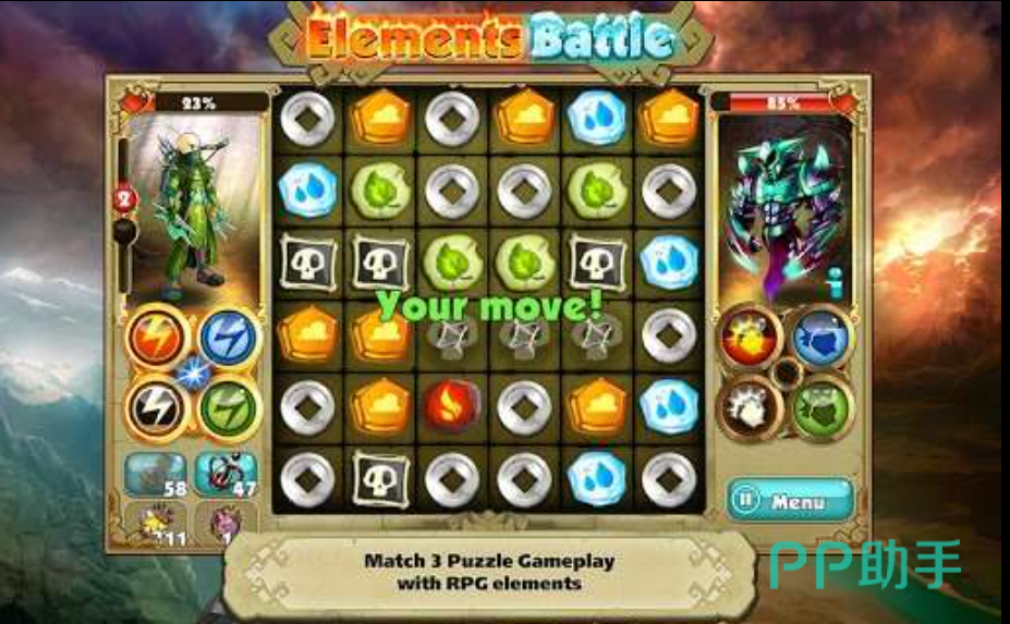 这款游戏画面简单明了,在这场游戏中,玩家将扮演年轻弟子的角色与不同重量级的对手一对一对抗来开始寻找师傅遗志的征程!在这场征程中玩家将会经历许多场战斗,虽然游戏难度会随之不断变高,但玩家自身实力也会不断提升,作为玩家的你可以运用手中的元素:火,水,空气和地球进行不同的排列分布与敌人对战,不同的排列分布则有不同的效果,十分考验脑力。