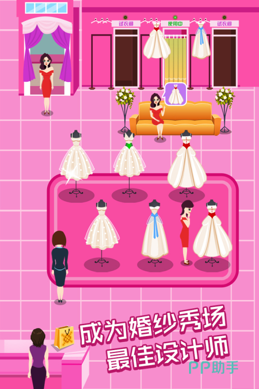 在婚纱店中,玩家为顾客们搭配婚纱礼服裙,挑战店长工作,进行模拟经营玩法。顾客挑选合适婚纱,就会结账支付,快速打包,立马售出。