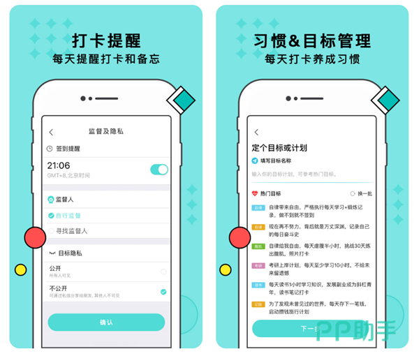 点进软件之后选择自己的目标,可以从背单词、减肥、跑步等预设中进行选择,也支持用户自定义。选择目标之后软件就会根据内容自动为我们规划好时间以及提醒,每一次开始执行的时候进行打卡,不断坚持,最后就能够向我们的目标靠近。
