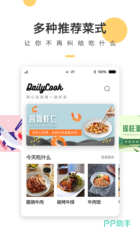 软件操作简单,通过滑动模式切换菜谱,每天推荐一道菜肴,当季时令新鲜食材的菜肴上线。它解决了家庭主妇的日常烦恼,设定了不同菜肴分类。