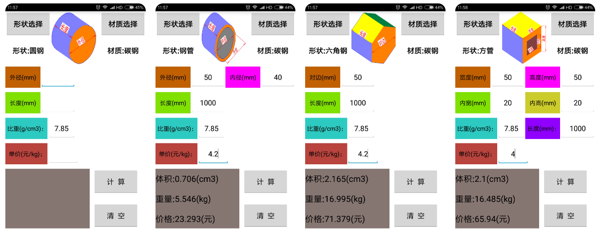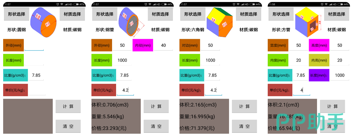 在做工程的时候,最怕的就是查表进行大量的计算,特别是计算重量。那么用这款软件就可以极大的提高小伙伴的工作效率。小伙伴们只需要按照形状输入数据就可以自动得出各种工程数据!