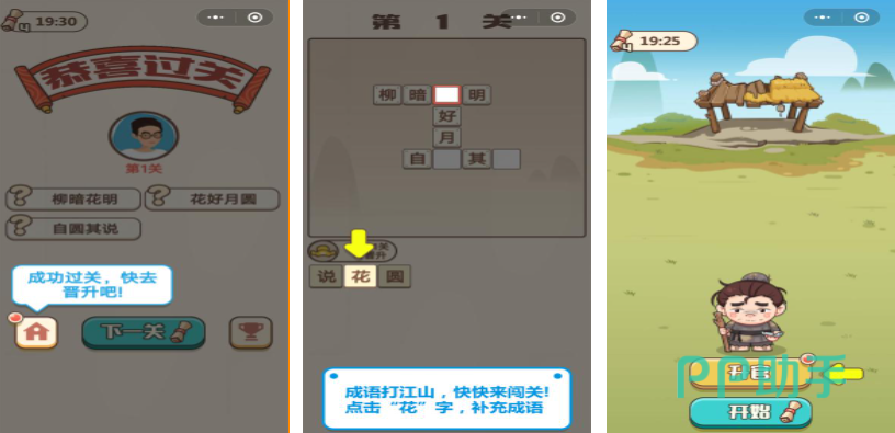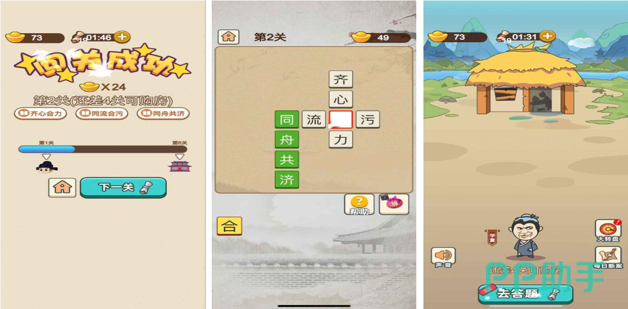 《成语打江山》这款游戏中打击可以通过过关来积攒经验,让里面的人物来升级官衔,从一个开始连房子都没有的穷书生升级成后面的大官,中间大家需要靠填成语来完成所需要的经验,还有抢答的模式是有时间限制的,根据一些提示来猜是什么成语,这种玩法很受玩家们的欢迎。