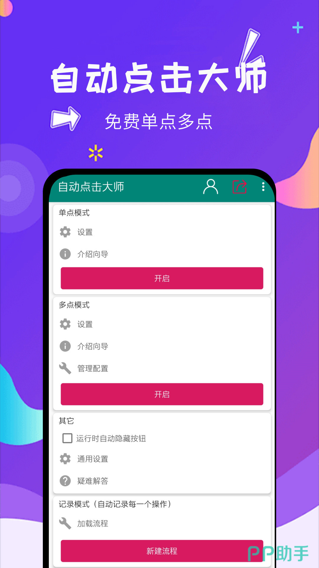 软件设定了识图点击、图片识别点击、文字输入点击等模式,通过多种规则轻松点击屏幕,掌握关键数据,还给出了操作流程图。