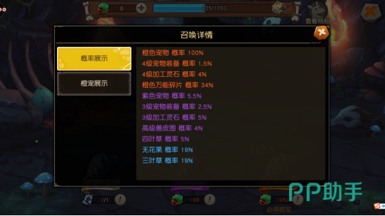 点开宠物宝库之后,玩家们会看到屏幕上方有一个蓝条,当蓝条满了之后,便可以开启宝箱。宝箱里有许多有关于宠物的装备和一些培养的药剂。但是需要充值一些RMB才能获得开启这个宝箱的特权。