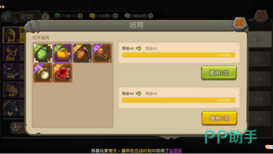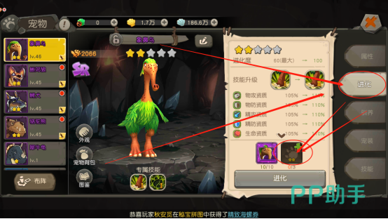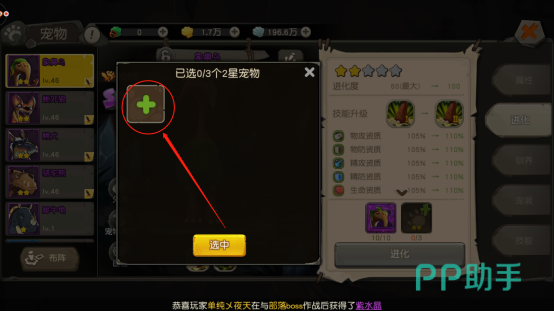 任意选择一个宠物,然后在屏幕右侧找到进化,点击进化之后,会出现如图画面,然后再点击图中在进化两个字上方圈住的兽脚掌印。