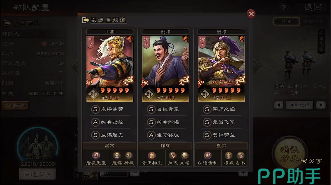 如果说主力队伍吃了那些核心战法。第二队就用剩下的那些,这样富贵骑,吃了竭力佐谋之后的群攻就能完美进行共存。有条件的话,再将群弓提成满配,最后剩下三个队伍中挑两个与对方进行五五块,最后一个用练度不高的进行碰瓷。