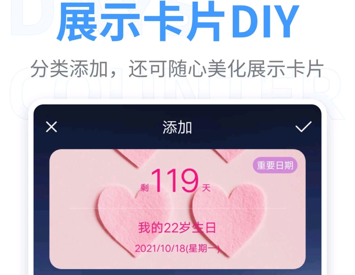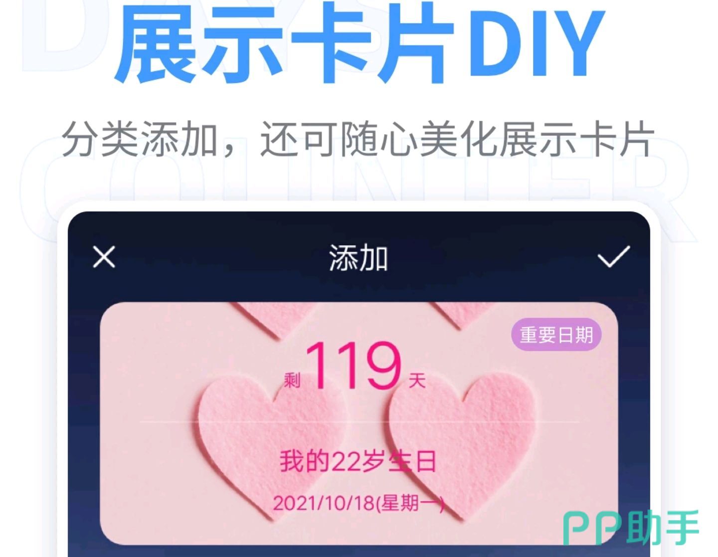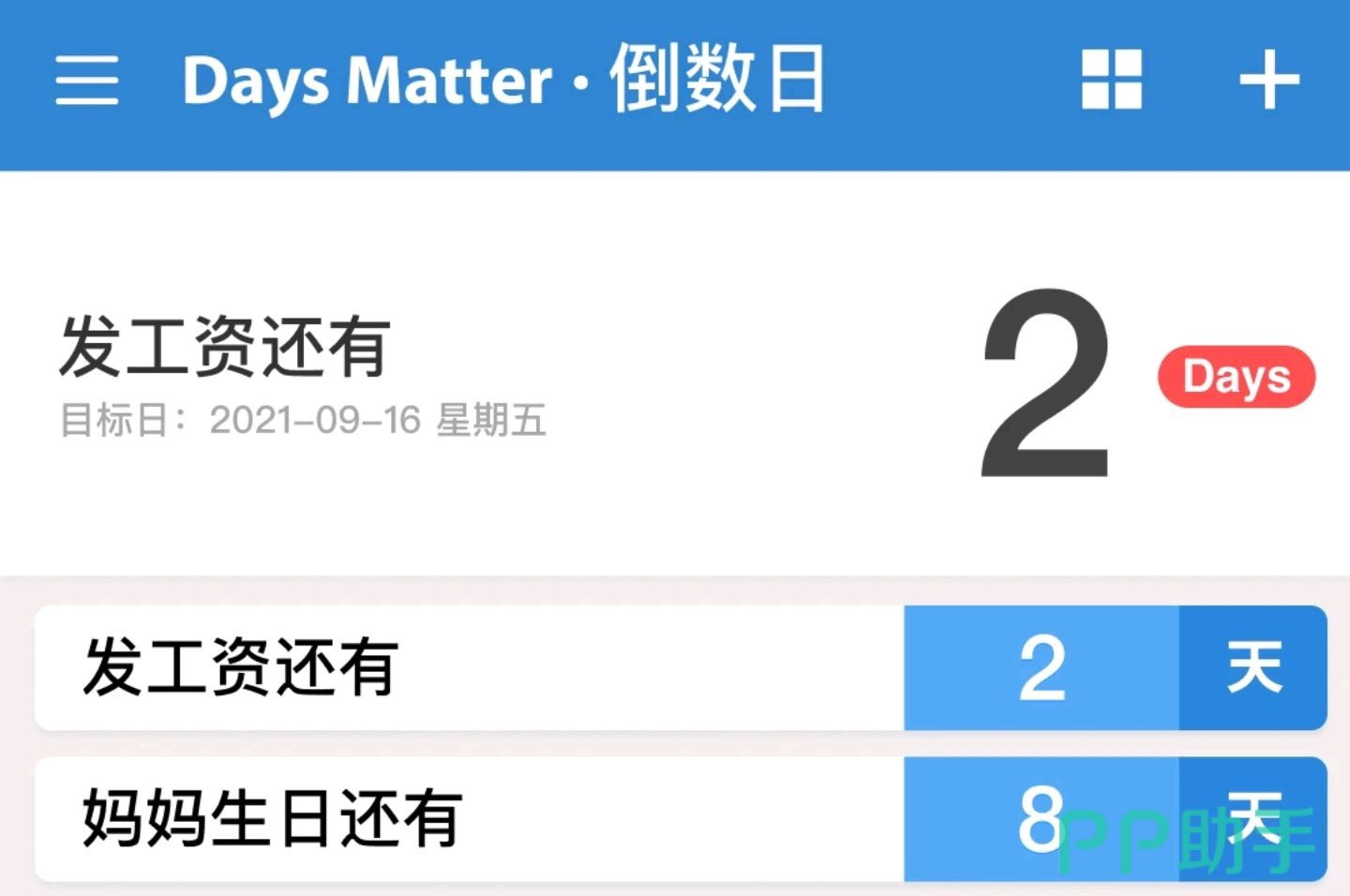 依然是必须给大家推的一款简洁记录重要日子天数的小工具,什么发工资日、还信用卡日、自己对象的生日、结婚纪念日等等只要输入一个特定的日期,都会直接生成天数,还可以以各种形式在手机上提醒用户。