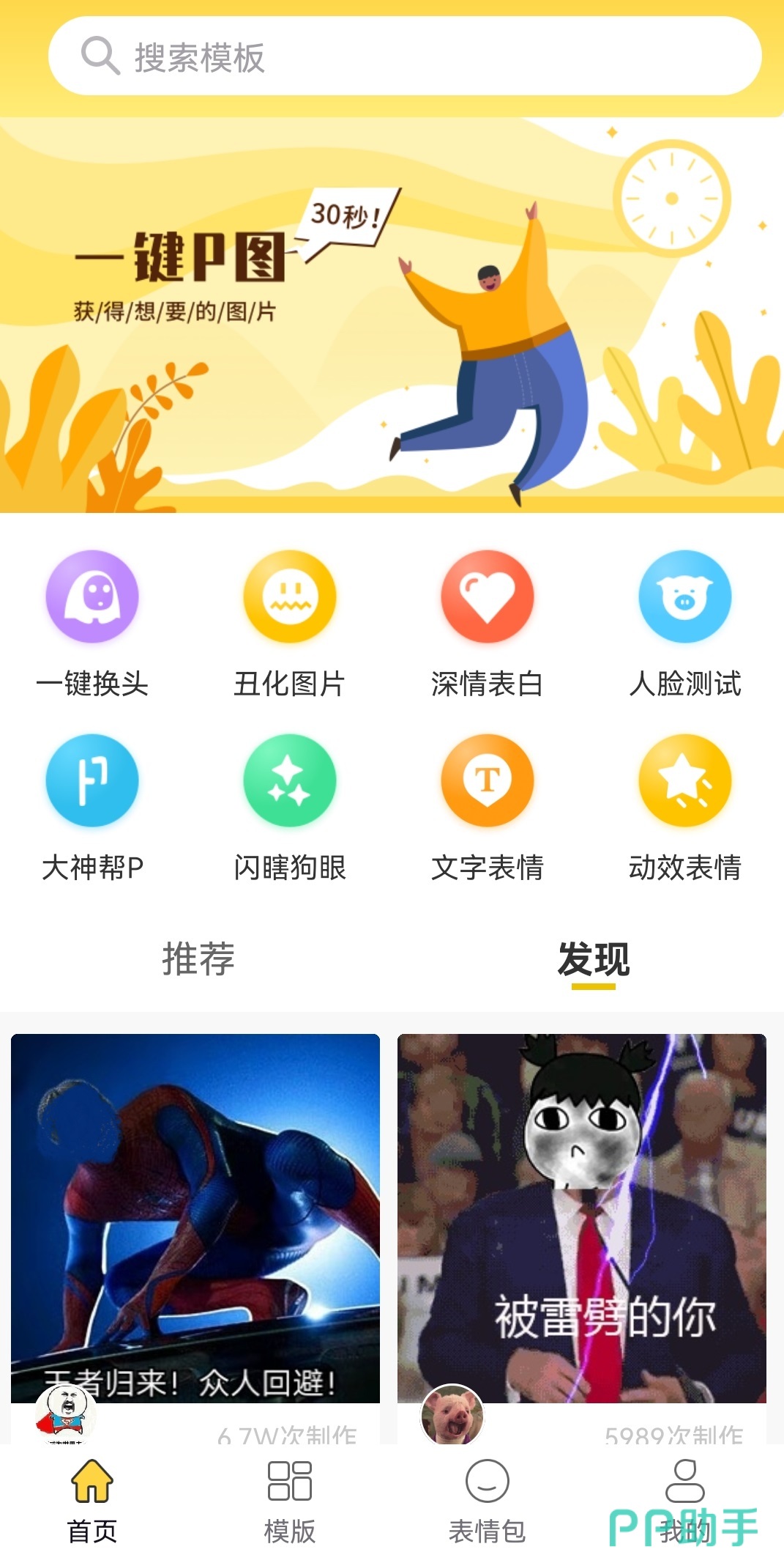 这款软件主打的就是恶搞向的p图功能,用户可以一键将人物头像换指定的背景模块上,并贴上各种诙谐的贴纸,轻松制作搞笑配图和好友的表情包。发挥脑洞开始恶搞吧。